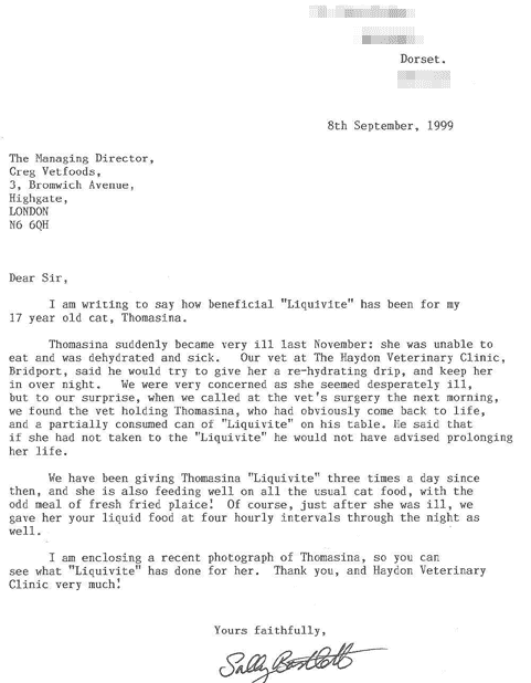 Sally from Dorset sent us the following letter: I'm writing to say how beneficial "Liquivite" has been for my 17 year old cat, Thomasina....