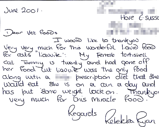 Rebekka Ryan from Sussex sent us the following letter: I would like to thank you very very much for this wonderful liquid food for cats 'Liquivite'...